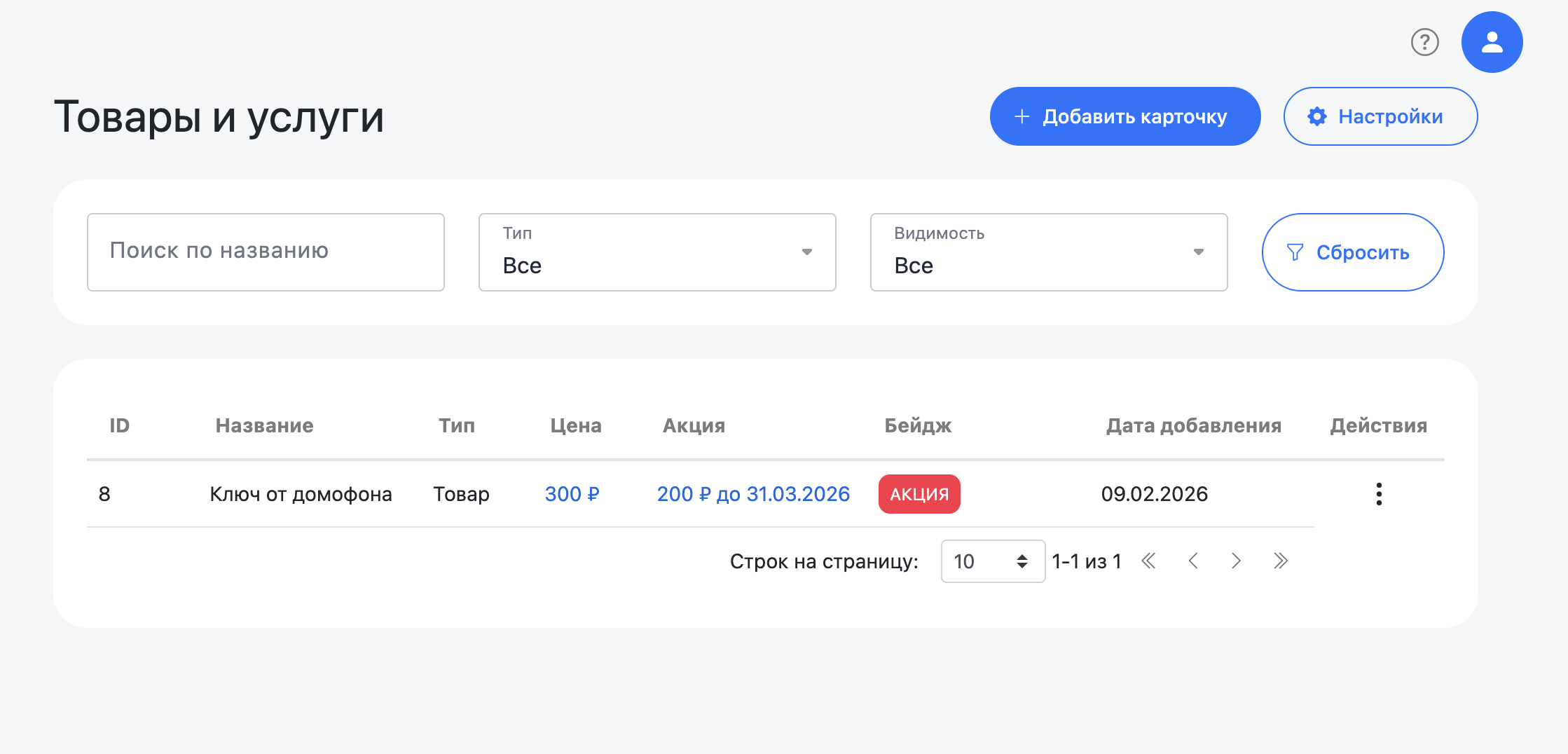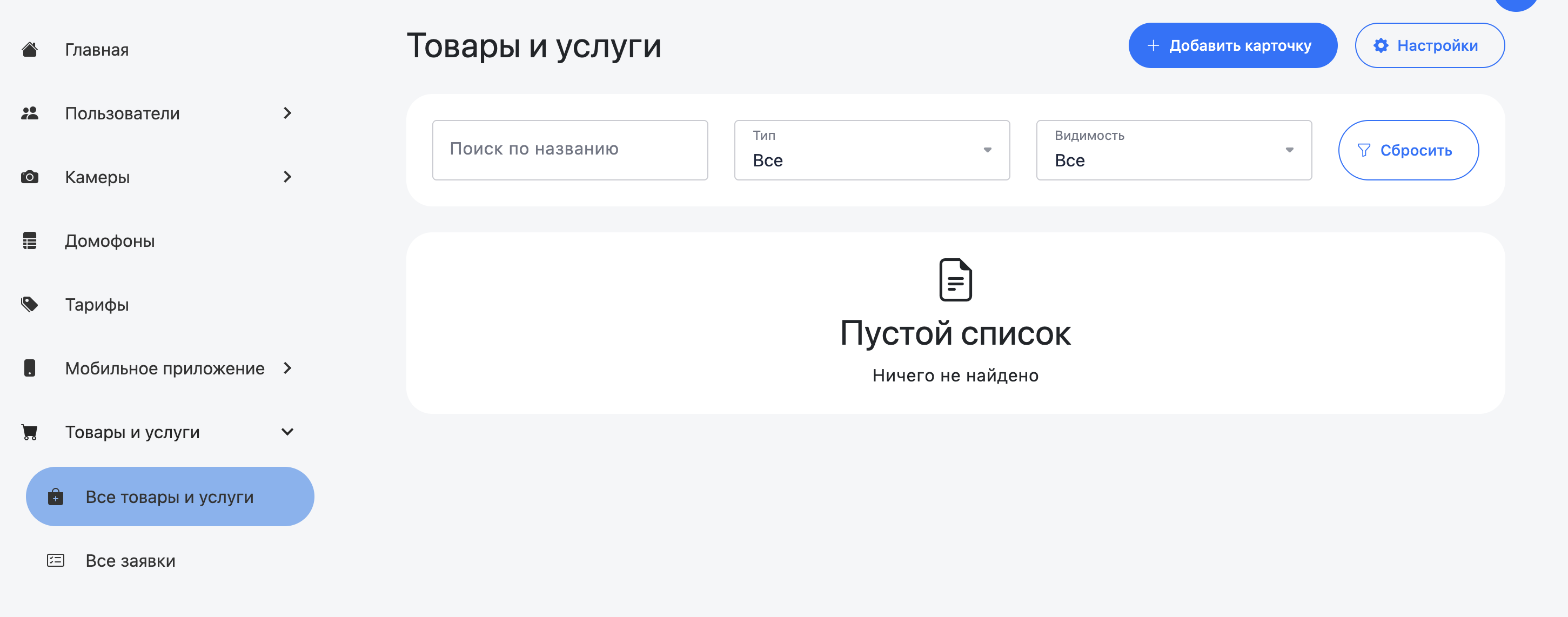 Чтобы создать новый товар или услугу, перейдите на страницу "Все товары и услуги" раздела "Товары и услуги" и нажмите кнопку "Добавить карточку".