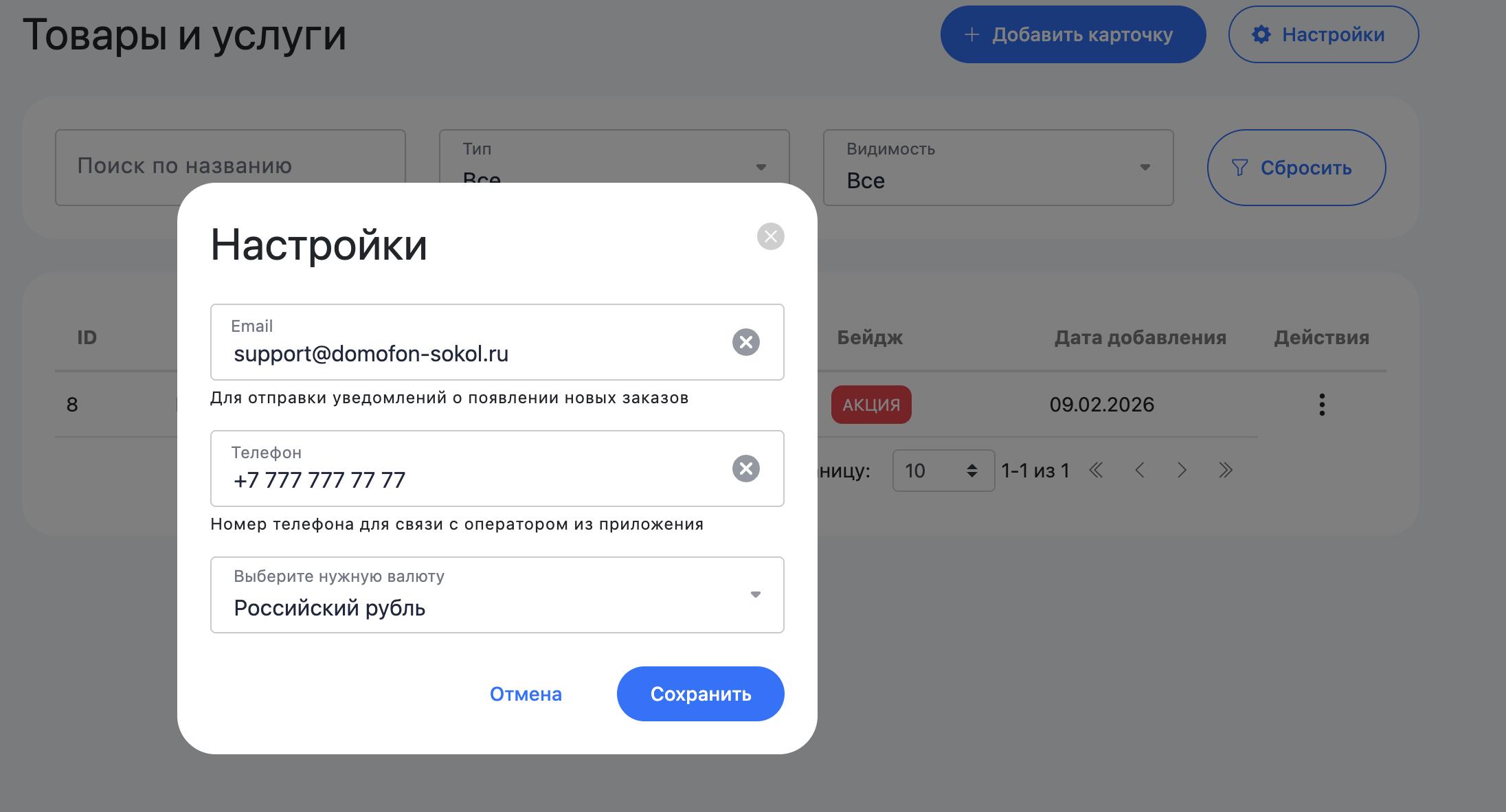Вы можете настроить уведомления и валюту. Для этого нажмите кнопку "Настройки" на странице "Все товары и услуги"