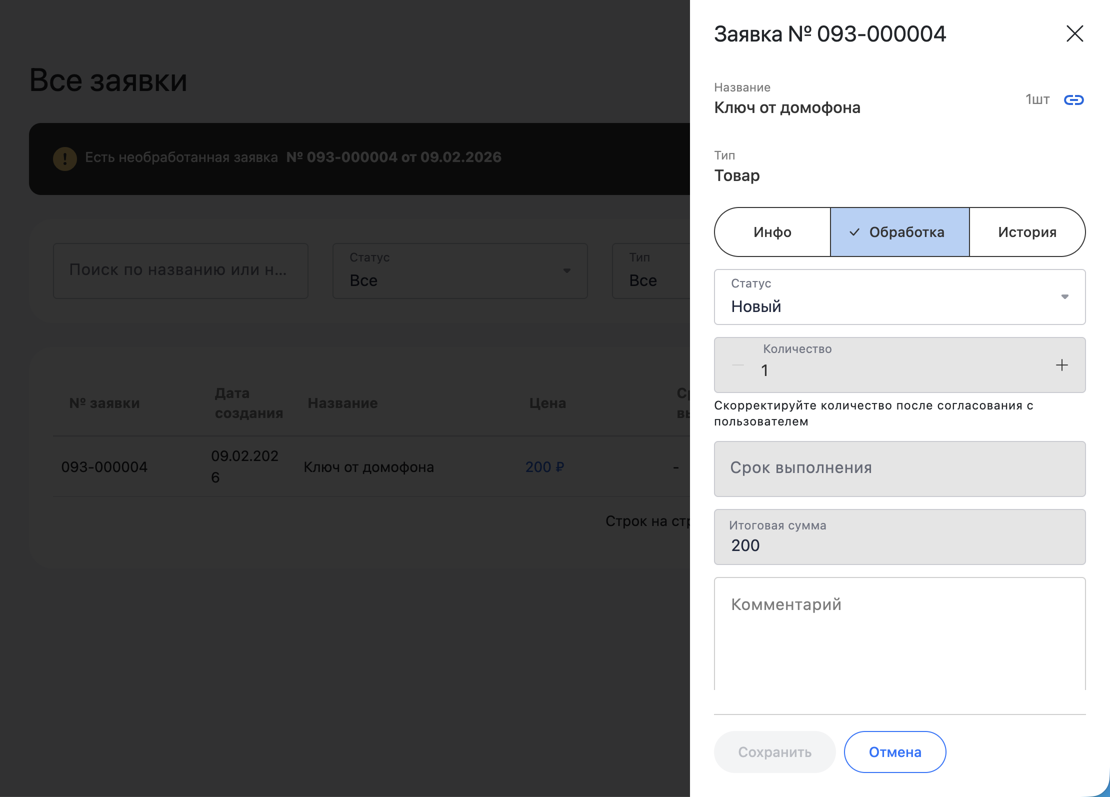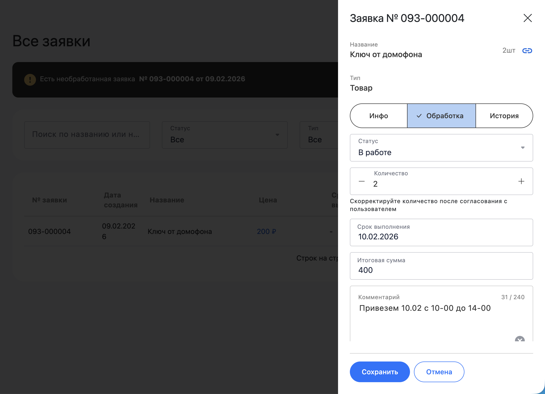 После изменения статуса на "В работе", вы сможете скорректировать количество, указать срок выполнения, а также оставить комментарий, который увидит пользователь в своем приложении.