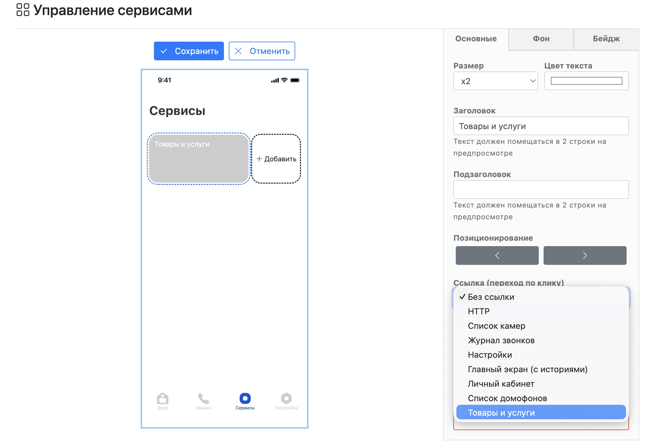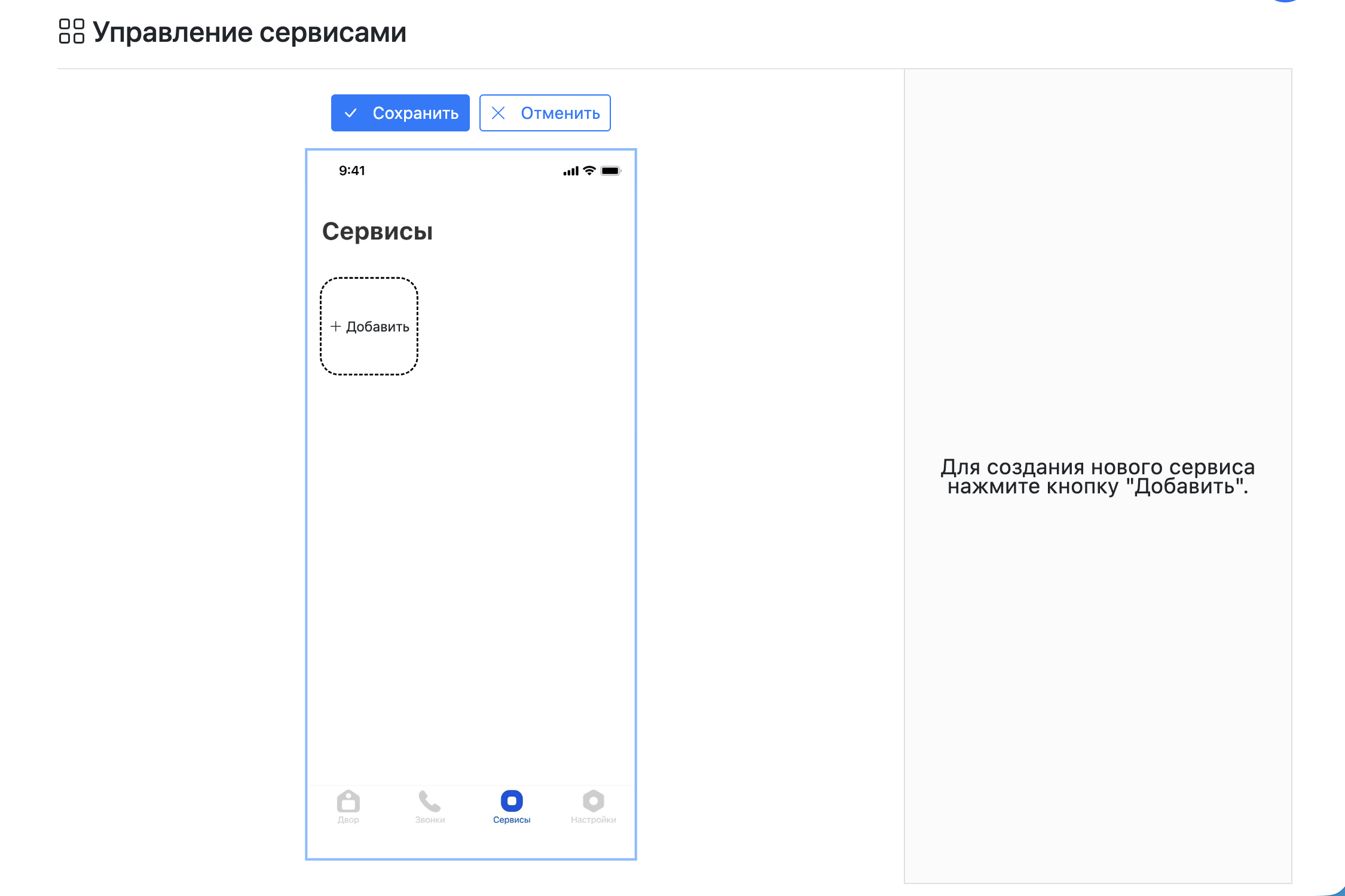 Чтобы в приложении пользователь смог попасть в раздел "Товары и услуги", необходимо на странице "Сервисы" добавить новую карточку со ссылкой на страницу "Товары и услуги". Для этого зайдите в раздел "Мобильное приложение" на страницу "Сервисы" и нажмите кнопку "Добавить".