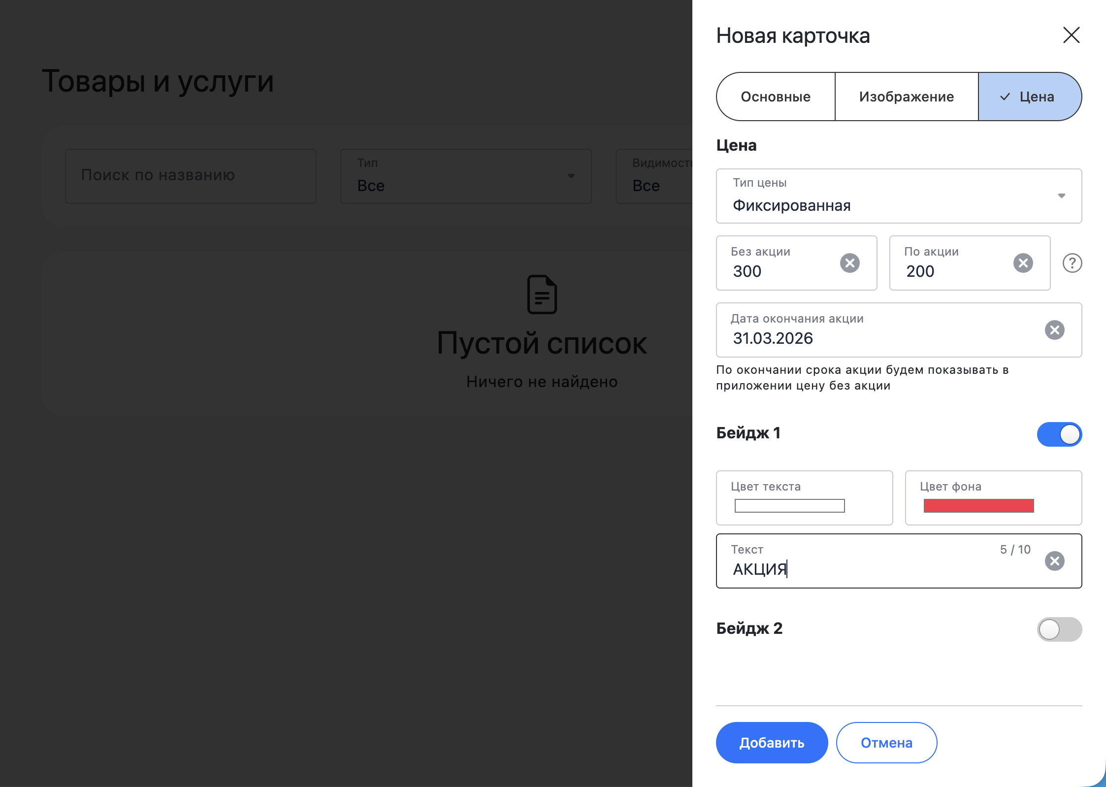 Выберите тип цены — "Фиксированная" или "Цена от". Затем введите цену, если на товар или услуг действует акция, укажите акционную цену и срок действия акции (при необходимости). Также для привлечения внимания к карточке вы можете добавить бейдж любого цвета с нужным вам текстом.
