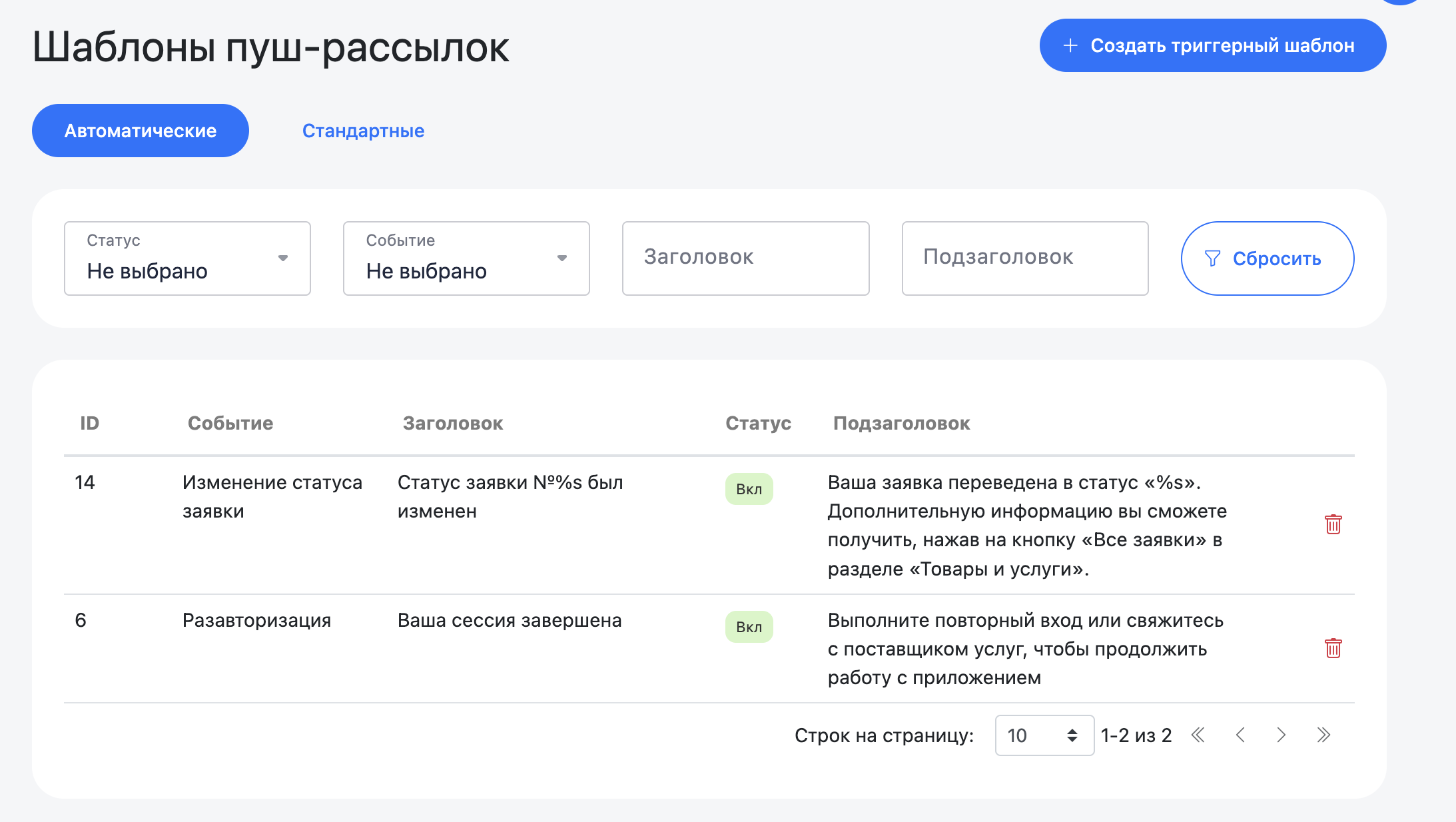 На вкладке "Автоматические" нажмите кнопку "Создать триггерный шаблон". Включите свитчер "Включить шаблон", выберите один из трех типов событий (изменение статуса заявки, изменения срока выполнения заявки, изменение заявки).
