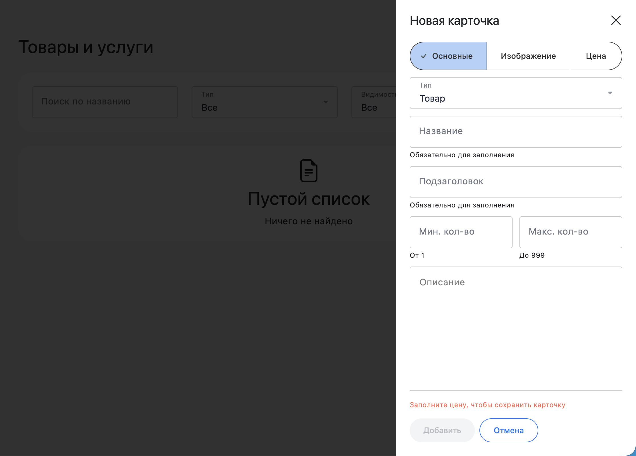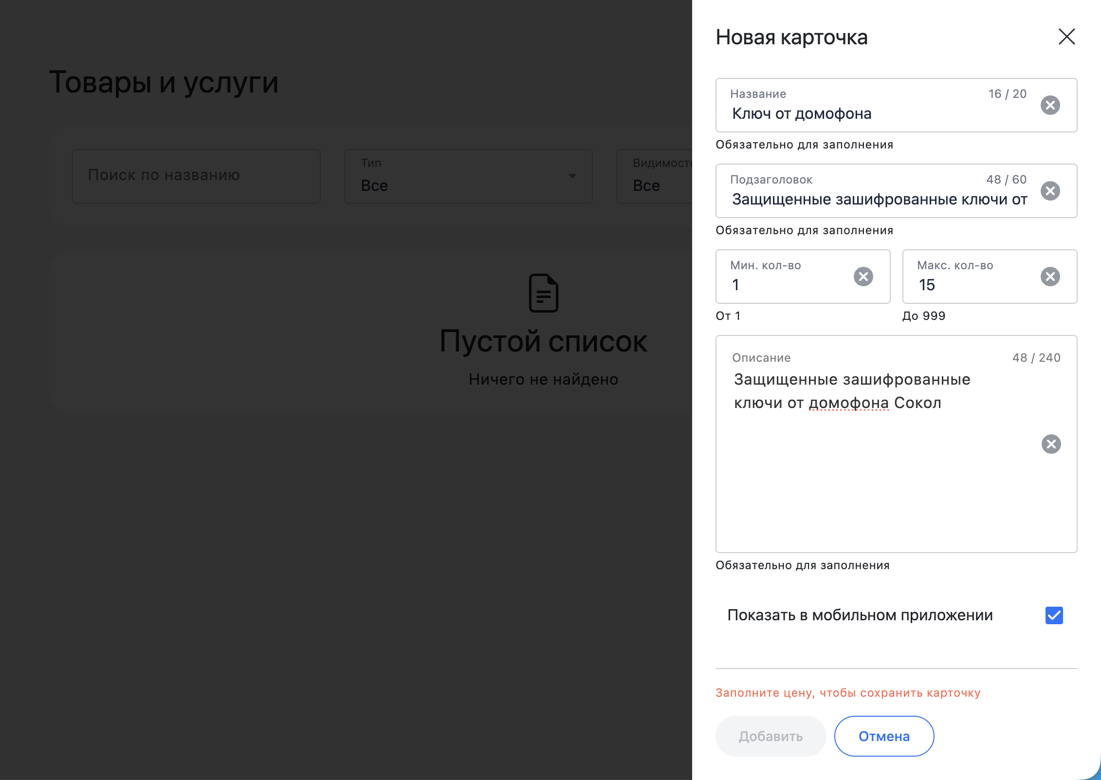 После того, как вся необходимая информация будет заполнена, нажмите кнопку "Добавить". Новая карточка появится на странице "Все товары и услуги".