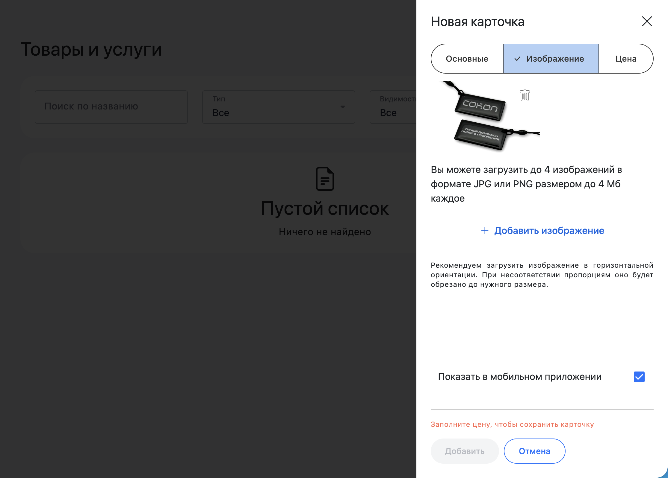 После заполнения всех полей установите галочку "Показать в мобильном приложении", если хотите, чтобы данная карточка стала доступна пользователям для заказа. Затем перейдите на вкладку "Изображение".