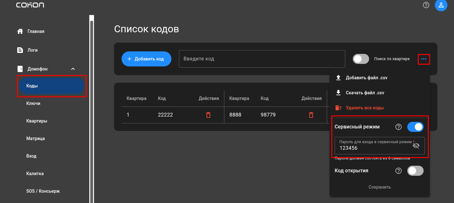 - Web-интерфейс - «Домофон» -> «Коды» -> 3 точки -> «Сервисные коды»